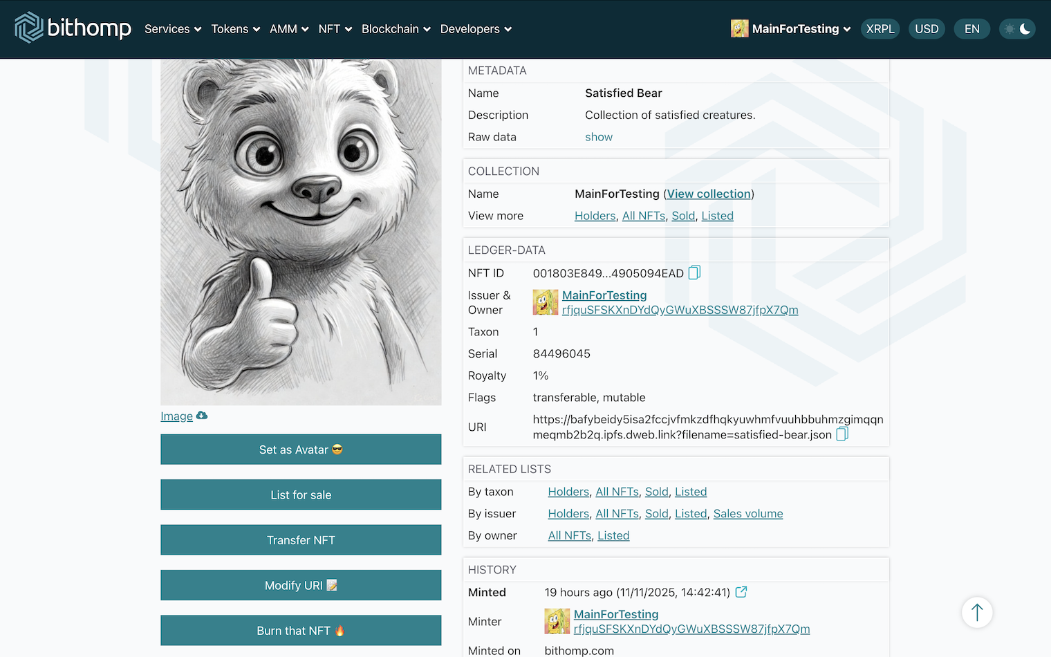 With Bithomp, you can do much more than explore. Our NFT tools let you mint, trade, and manage your XRPL AlphaNet NFTs directly from the same interface — quickly, securely, and without intermediaries.