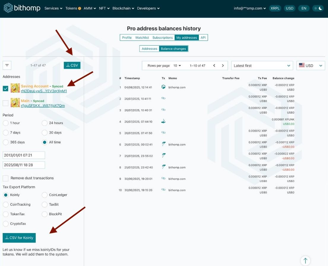 Set your filters (select the date range), remove dust transactions if needed, and press the CSV button to download your file.